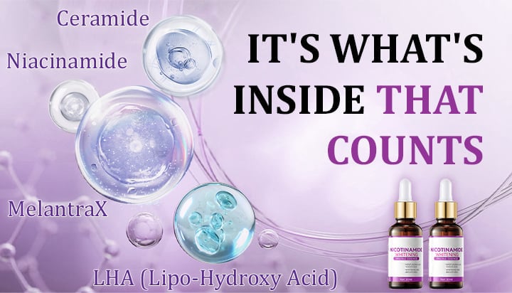 The powerful combination of Niacinamide, Ceramide, MelantraX, and Lipo-Salicylic Acid delivers unparalleled skin rejuvenation. This dynamic blend dramatically brightens the skin, fades dark spots, and evens out skin tone while deeply hydrating and strengthening the skin’s barrier. With its exfoliating action, it smooths the skin's texture, revealing a radiant, youthful glow. Together, these ingredients offer an extraordinary transformation, turning dull, uneven skin into a flawlessly smooth, luminous complexion with visible improvements in skin health and vitality.